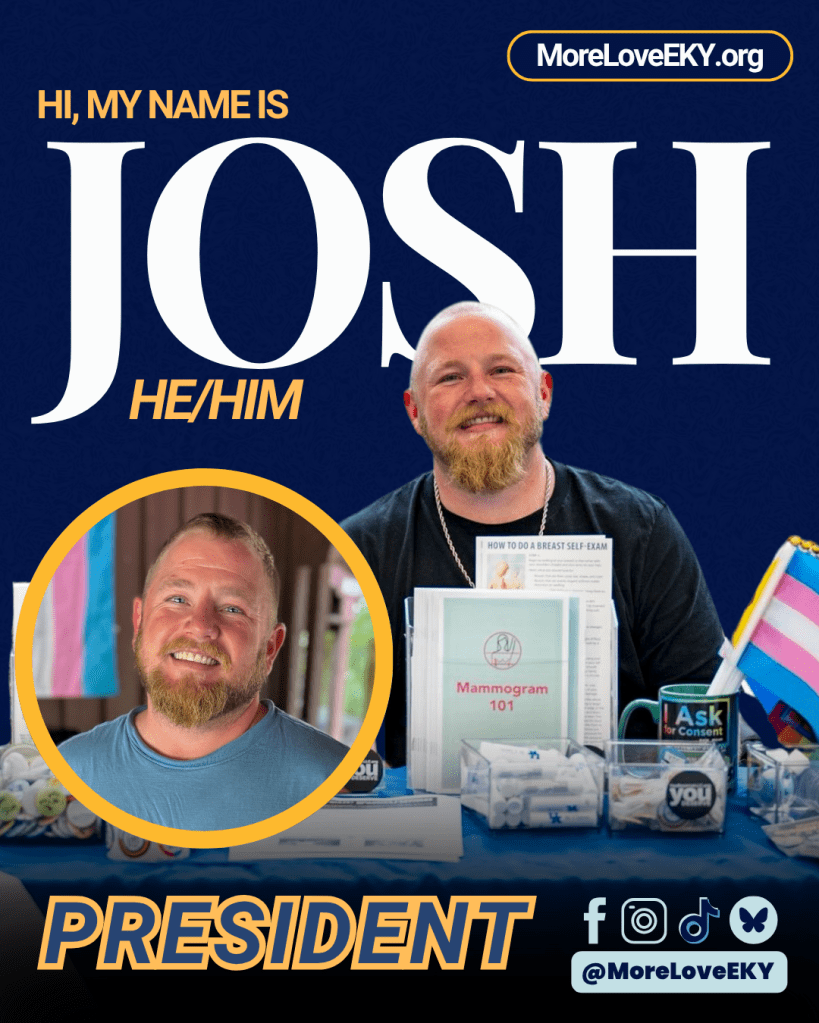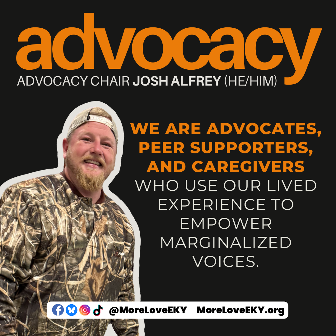 Josh A. Alfrey (he/him) is a founder of MoreLove and proudly serves as President and Founding Advocacy Chair. In this role, he is committed to uplifting marginalized folks in rural Kentucky. Josh has always sought to be part of something that creates meaningful change in people’s lives, and MoreLove has given him that opportunity.